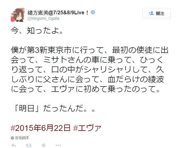還有滿身是血的凌波零、第一次坐上 EVA。 就是「明天」阿...」 - 節錄自緒方惠美 twitter -